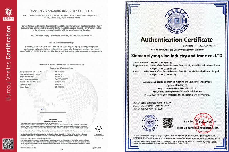 Odpověď: Máme FSC, FDA, SGS, VOC a shodu s environmentálními předpisy, jako je RoHS, 94/62/EC a US TPCH. Naše továrna má certifikaci ISO9001 jako přední mezinárodní dodavatel a vývozce obalů.